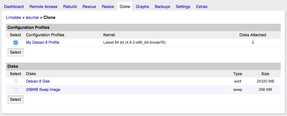 This guide will show you how to clone your Linode’s existing disks or configuration profiles to another Linode on your account.